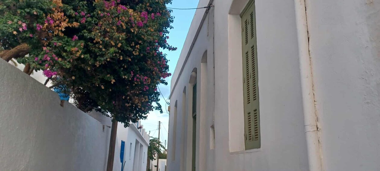 Τα λευκά σπίτια με τα μπλε παράθυρα, τα μικρά σοκάκια που κατεβαίνουν προς τη θάλασσα και οι αυλές με λουλούδια δημιουργούν μια αίσθηση ηρεμίας που δεν την βρίσκεις εύκολα.